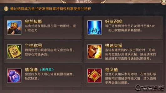 2)金兰好友在同地图组队可得金兰技能增益,消耗结义值可升级;