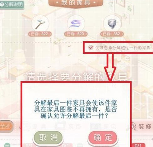 注意:如需分解只有一件的家具,需要取消【仅可选择分解超过一件的家具】选项。