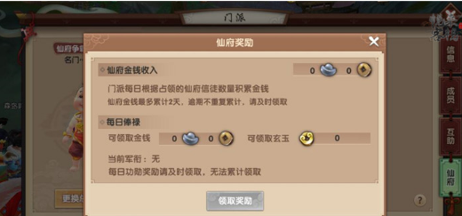 门派占领仙府后,根据所占领仙府的类型不同,每天会获得不同的金钱金钱及玉果奖励,各位仙友也可以在“门派—仙府—领取奖励”界面按仙府收入和自己的军衔领取相应的金钱及玄玉奖励。