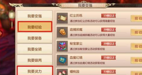 使战力提升的方法当然不仅有以上几种,仙灵等级的提升、法宝技能增强也能够提升战力。除了装备、坐骑等直接相关的要素,银两等素材的获取也是变强的必要条件,而对于所有与变强相关的要素,在《蜀门手游》中的变强功能中都有分类细致的引导,只要从中选择自己迫切需要的类目,并跟随引导进行活动,一定能得到令人满意的答案。