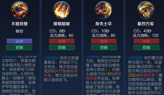 苏烈死亡后会满血复活,复活后有接近5秒的时间不能行动,期间免控减双抗,结束后对敌人造成AOE伤害和减速效果,自身提速,这个技能效果相当于苏烈自带复活甲!