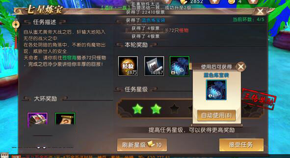 七星炼宝任务可以通过金票来刷新星级,最高是7星。