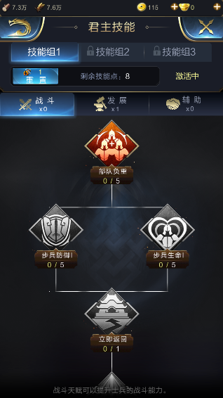 顾名思义,战斗技能主要是增加主公军队的实力,同样还有一些能在瞬息万变的战场中使主公反败为胜的主动技能!如果战斗系技能加满,君主的战争实力一定会大幅度增加!战斗系一共有3个主动技能,需要主公根据战场情况来择机使用!3个技能分别是立即返回、总动员和救援技能。