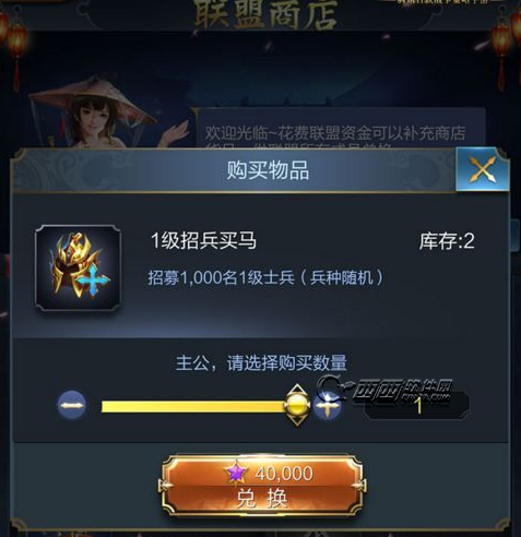 1级招兵买马使用以后可以立即使得主公获得1000名随机的1级兵种。价格是40000点个人积分。目前来说,1级招兵买马是所有联盟商品中最为有用,性价比最高的。