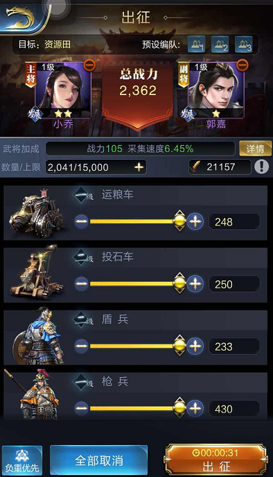 行军打战粮草是必备的,要想扩充实力增加军力才能更好的打仗,获得粮草有两种办法