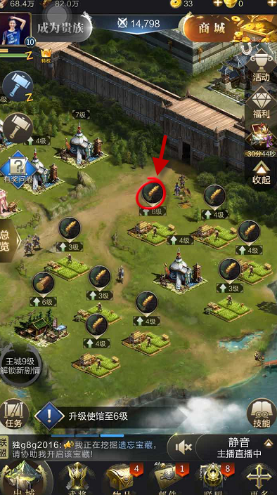 1、在城外派人耕种粮食,等待收割可以获得大量的粮草,点击标记处即可一键收割