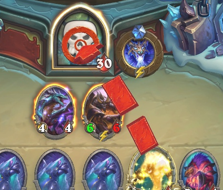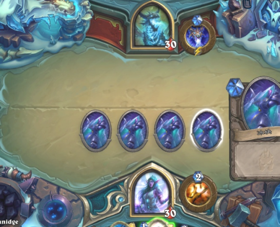 “冰块”相当于小鬼传送门那样的永久物,只不过是白板,也就是说玩家在这一关里一上来就会被锁住4个随从格。再加上Boss的技能会让普通的随从交换进一步锁住更多的格子,显然是要鼓励我们打法术爆发了(当然,武器爆发也是可以的,反正锁格子影响不了砍脸)。