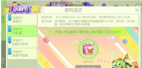 活动内容:活动期间,与CP/基友/闺蜜的亲密值每提升520点,可开启一次CP礼盒,参与双刷节可提升亲密值。
