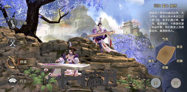 逍遥是远程法术攻击门派,招式华丽,控制爆发都很出色。同时具有蓄力和高强伤害,技能千变万化,气血、攻击、减伤、控制是主要特性。无论是在PVE还是PVP中,逍遥一直是一个进行远程控制并保证输出的职业,外加各种BUFF加成,往往能让你在战场外就带走敌人。本职业对玩家来说上手有一定难度,需要时刻注意走位拉开与敌人的距离,是个拼眼力和手速的职业。