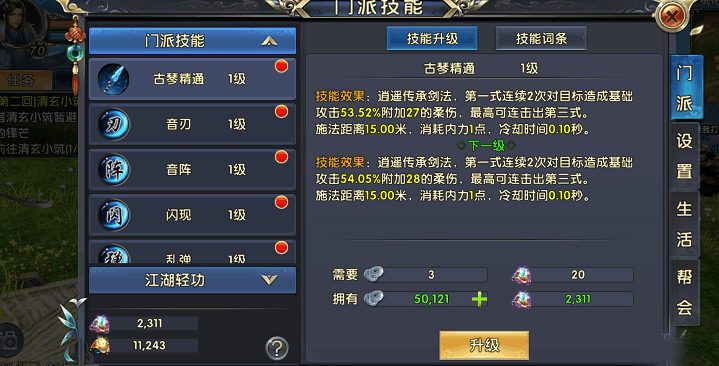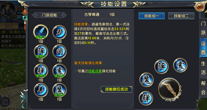 在技能专属经验不足的情况下,建议先对以下技能进行加点。首先是普攻技能古琴精通,必须加满。它的第一式连续两次对目标造成伤害并附加柔伤,最高可连击出第三式。虽说是一个单体锁定技能,但是其冷却时间短而且施法距离远,能让你安全的进行输出。