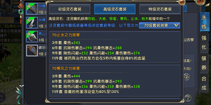 这里给大家推荐寒风之力套和青龙之力套。前者11套的效果为音魔的伤害浮动变为80%至130%,这个伤害加成是很明显的,极大提高了逍遥的输出能力。后者6件套的效果是血量高于80%的目标增加10%伤害,11件套时血量低于20%重置所有技能冷却时间。