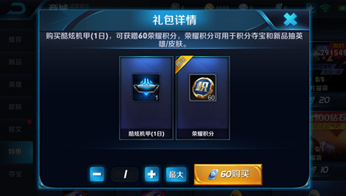 1、 在特惠商城直接购买荣耀积分礼包:价格为60点券,礼包自动打开,获得酷炫机甲(1日)的同时,会赠送60积分;