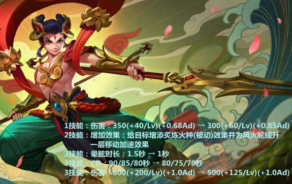 1技能:伤害:350(+40/Lv)(+0.68Ad) → 300(+60/Lv)(+0.85Ad)