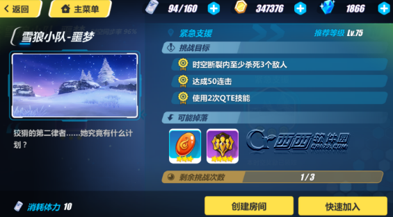 崩坏3雪狼小队噩梦第7关三星攻略,崩坏3雪狼小队噩梦第7关三星条件分别是断裂空间杀死3个敌人,50连击,2次QTE,三星通关可以获得钻石奖励,那么雪狼小队噩梦7三星怎么过,西西带来崩坏3雪狼小队噩梦第7关三星攻略,希望对大家有所帮助。