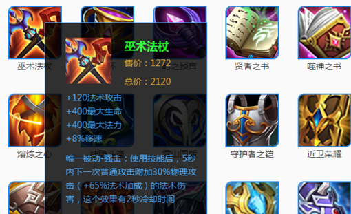 巫术法杖:基础属性中的法术强度从120提升到了140,被动的伤害效果也从0.3AD+0.65AP提升为0.3AD+0.8AP。