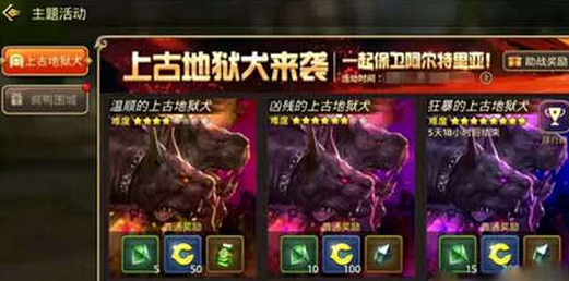 冒险小队进入之后可以选择这三个难度的挑战。奖励是一些必需的材料和稀有称号的奖励。玩家击退上古地狱犬之后可以获得上古点数的。