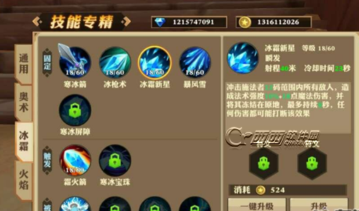技能介绍:作为官方默认的专精,它的实用性自然不用怀疑,主动技能有释放灵活的单体技能,也有需要施法前摇的范围伤害。被动技能是使减速程度更高。触发技能则是补足伤害与减速。
