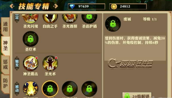 虔诚.减少自身受到伤害的百分之二十,并免疫控制效果持续6秒。(神圣专精不可以被控制已成事实)