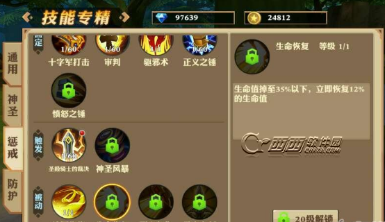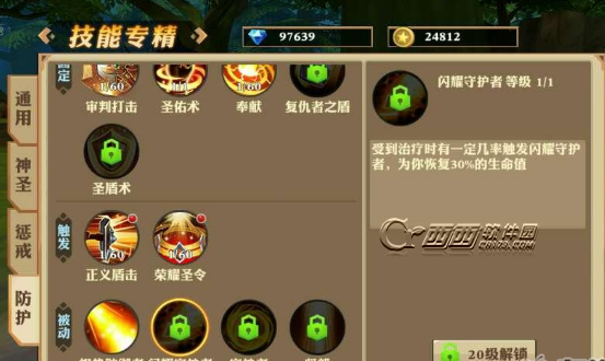 技能介绍:作为一名骑士,为队伍抗住伤害才是要紧的,防护圣骑做到了这一点!主动技能有增加法术抗性的圣佑术,有伤害不高的范围技能,最要命的是无敌技能圣盾术。触发技能是增加护甲和提升治疗量的盾击,还有大幅恢复HP的荣耀圣令,被动技能则是增加坦克程度的技能,值得一提的是闪耀守护者。