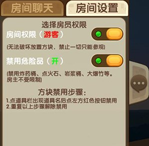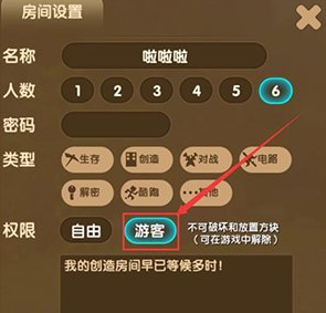 在房间设置中,可以设置游客权限(不可破坏和设置方块),还可以设置房间的人数、密码和类型。