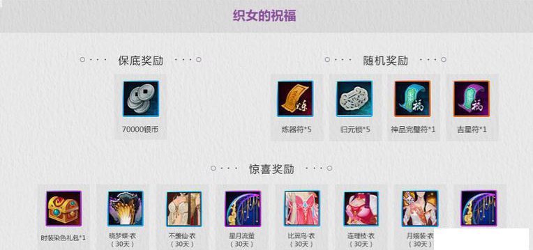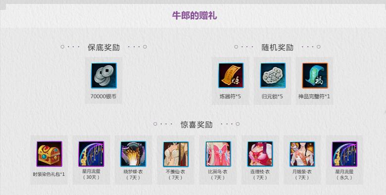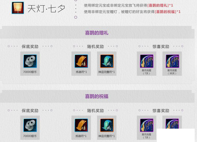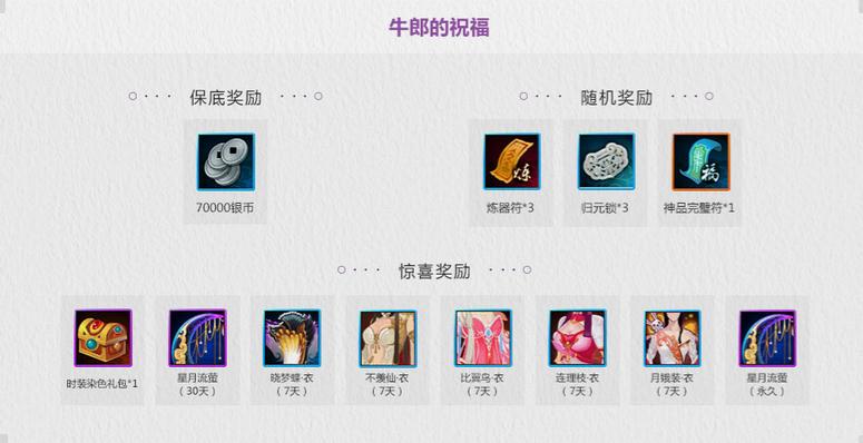 活动内容:仙友们放飞天灯,将收获来自牛郎织女的赠礼同时会获得特殊称号<有情人>。仙友可前往商城【奇物】一栏选购心仪的天灯,同时每日的活跃度奖励也会赠予仙友一定数量的天灯。