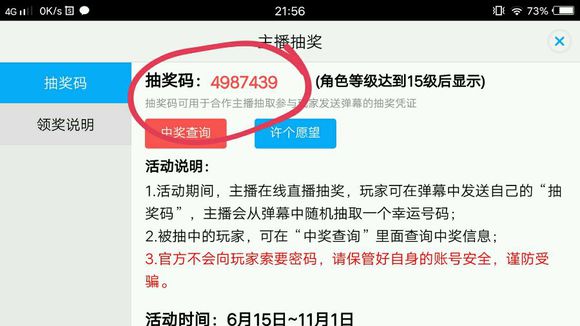 在游戏的用户中心中,玩家们可以拥有一个属于自己的抽奖码,这个抽奖码要到15级之后才能显示,没到15级的玩家可是看不到的哟