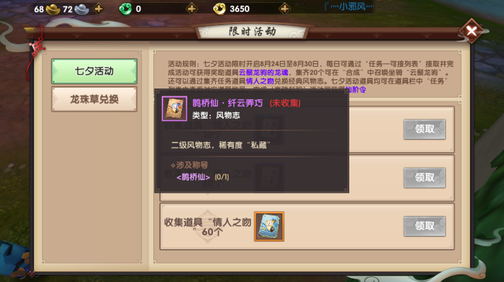 收集30个情人之吻领取风物志鹊桥仙纤云弄巧,即可获得紫色称号鹊桥仙