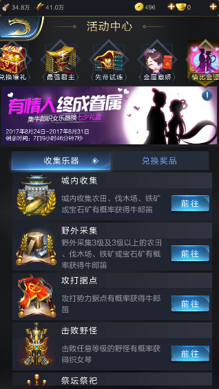 活动时间:8天整,需要收集牛郎笛和织女琴。