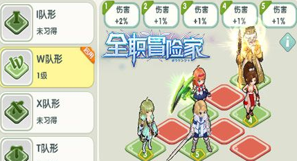 目前共有I、W、X、T、N、V、A、U这8种队形,不同阵型可以为队伍中不同位置上的伙伴或组队队友带来不同的属性加成,增加的属性有速度、防御和伤害。队形的学习需要消耗队形手册。?