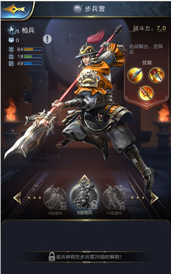 枪兵:克制骑兵,直接斩于马下,有着不错的防御和攻击,技能是长矛、猛攻、致命一击。