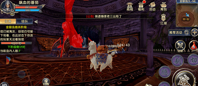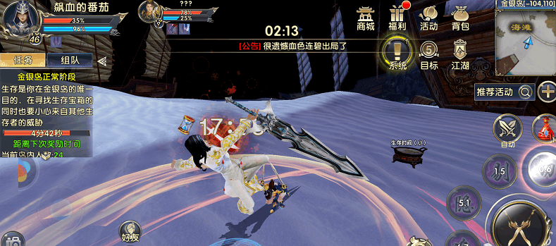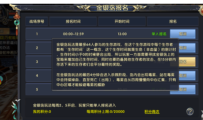 首先说一下金银岛的玩法,这是一个多人参与的生存游戏,活动参加人数一共为64人,最低进入等级为35级,只能单人报名。在岛上,会有一个生存游戏,每个玩家都有生存时间的倒计时,当时间归零,玩家即会出局。想要活到最后,成为最终的胜利者,就必须尽可能多的增加自己的生存时间,具体方式有两种:寻找岛上的采集物,来增加自己的生存时间;击杀他人,掠夺其生存时间。