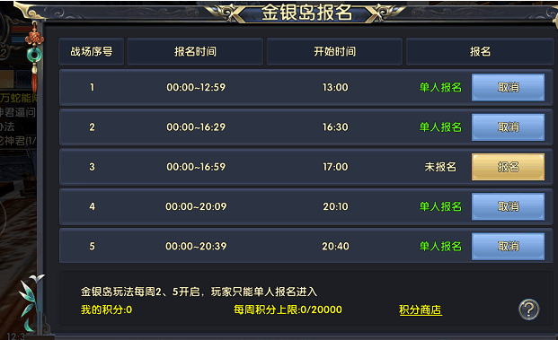 活动每周二、周五开启,从中午12:15-晚上21:00一共有六场,玩家要想参加的话必须提前报名。这里为了给玩家看看金银岛的实战是怎么样的,报名了下午一点的活动,坐等入场。
