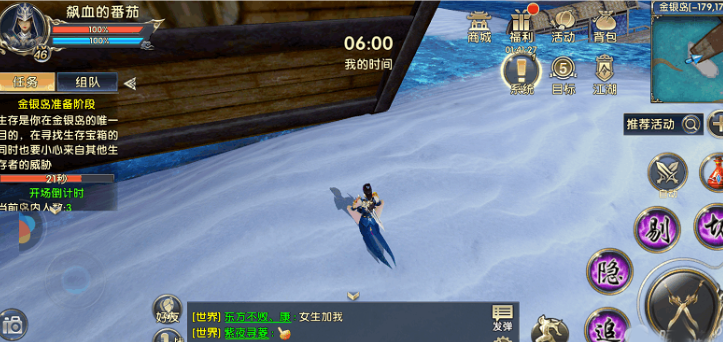 开场前一分钟,报名的玩家会被提前召唤进副本,位置是随机分配,你可能会在沙滩,或是在雨林。初始提供的时间是6分钟。此时角色处于无法操作状态,左边任务会告诉你现在处于准备阶段,同时显示开场倒计时并告知当前岛内人数。我被分配的位置是在沙滩大船的角落,坐等开场。
