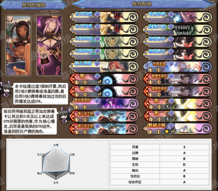 输出:A 作为otk卡组,单回合输出相当稳定,配合攻击力buff轻松秒杀主神,但是面对圣盾、坚壁或较高的护盾就比较依赖误入歧途,要求较高。