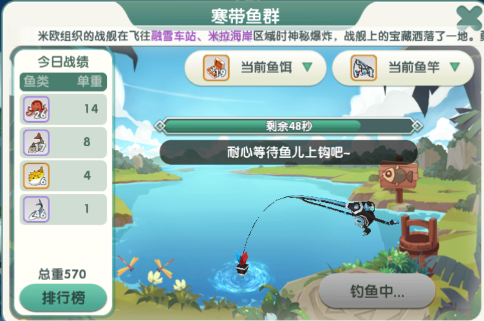 4:钓鱼需要在米拉海岸钓。海边会刷新海洋鱼群,每个鱼群平均存在20分钟左右。比较固定的鱼群一般在3个左右。