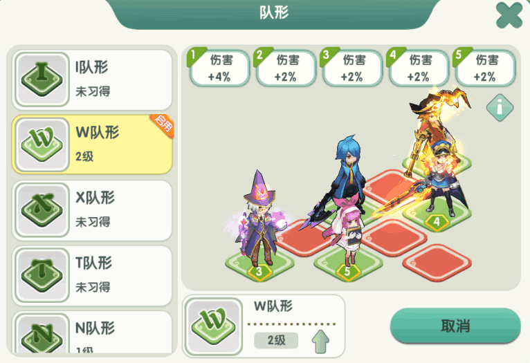 我们队伍打怪挂机一条龙常用的队形是W队形,这个队形有利于增加伤害,刷怪一条龙能快些,队形通过队形手册来习得,而队形手册呢就得主靠打boss了,建议平民新手些不要在升65级前乱用钻石啊……俺就是吃了这个亏,现在65了想抓一个好的宠物熊却因为囊中羞涩只能刷出一个普通性格的完美熊就将就着用了,前期的宠物不要花太多精力去培养,因为到了65级都是要换的,65级可以扑捉的熊是平民最适合的厉害的宠物了,65级前用任务发的扑捉劵捉个优秀的蘑菇头用就可以了。