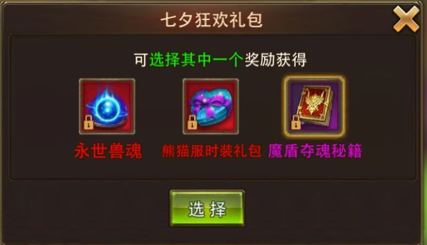 永恒纪元七夕狂欢礼包中有三种奖励:永世兽魂、熊猫服时装礼包盒磨盾夺魂秘籍,那么七夕狂欢礼包哪个好,下面就是永恒纪元七夕狂欢礼包奖励选择推荐,希望对大家有用。