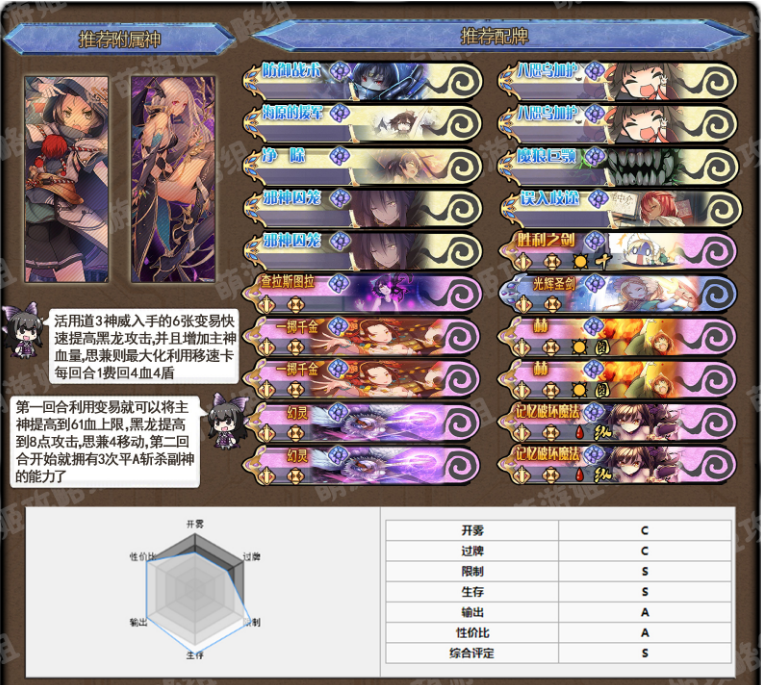 比如王栩+猴子,可以利用弹幕优势强杀前2回合脆皮的黑龙。再比如主流的道2超新星,可以从思兼神入手,利用迦楼罗秒掉思兼神,然后希哥衍生物对主神或者黑龙进行斩杀。