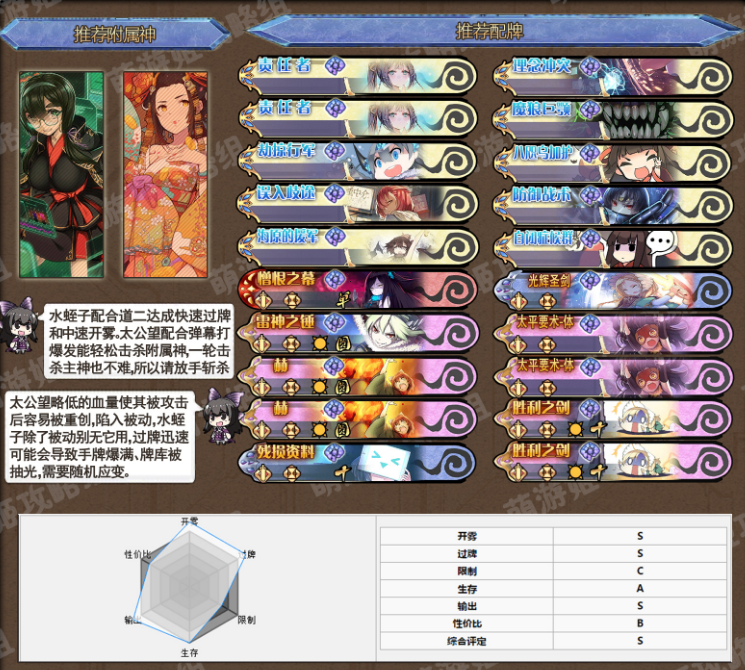 性价比:S 太公望和水蛭子都为金附属神,配卡方面要求极低(略影响强度),没有必要的卡,核心卡也是可替换的。比如没有憎恨之幕可以参照进攻方式—八卦炉2。