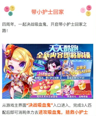 目前关于决战吸血鬼的具体玩法还没有曝光出来,不过可以猜测,这应该也是一个收集兑换的活动,有可能会类似降妖秘境一样,小伙伴们通过奔跑的过程中收集道具来攻击吸血鬼,通过击打吸血鬼会掉落相应的胜利勋章,最后通过掉落的勋章来兑换这次活动的奖励。
