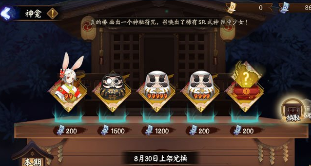 8月30日阴阳师更新之后会把神龛商店商品替换,之前还没换的要在今天之内换掉~而后续会有阴阳师周年庆的大型活动,神龛预计会上更好的商品。可以等明天更新之后再行观察,不用一口气花光所有御札~