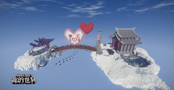 七夕天宫地图主体由两个空中岛屿构成,一边是桃之夭夭、灼灼其华的桃林,另一边则是一座秀美的天宫。红色桥梁连接了两片岛屿,寓意牛郎织女鹊桥相见的美好故事。空中桃林楼阁大有仙境之意,整体风格简约小巧,为喜欢想象、善于创造的冒险家提供了自由创作的更多空间。而参与活动的玩家只需在鹊桥上方的爱心搭建出对方的姓名,通过点亮的红石爱心传递满满的感动。