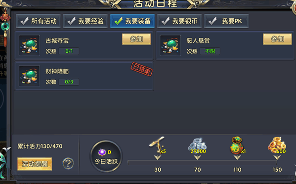 很多玩家前期都是以升级为主,身上的装备都是通过任务得到的。虽然任务给的装备不算差,但还称不上是极品。装备的品质是提升自身属性的主要来源之一,极品装备对战力的提升是显而易见的。那么哪些途径可以获得极品装备呢?首先是古城夺宝,击杀精英、首领怪可掉落大量宝物。不说橙装,每次必得珍品装备还是很可观的。恶人悬赏活动,这是一个世界BOSS的玩法,玩家对恶人造成一定伤害后就能得到奖励,奖励中就包括不少珍品装备。