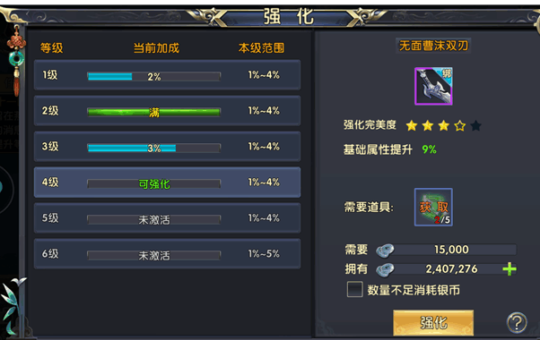 既然极品装备弄到手了,那么接下来就是对装备进行打造强化了。在《卧虎藏龙贰》中,每件装备的最大强化等级为六级,但是每级又有强化加成,强化加成越高装备属性也就越好,系统会根据强化完美度赋予装备不同的星级,相当于二次强化。在这里建议玩家把每一级强化加成值都提升到最大,这样属性才不会差。