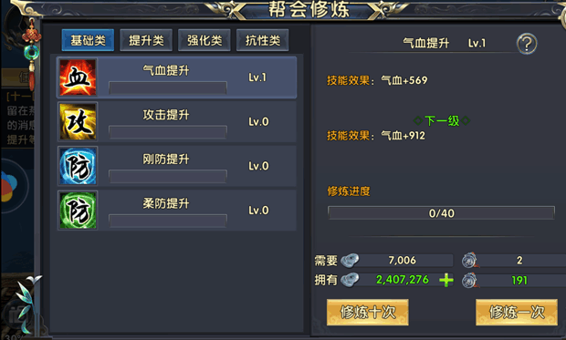 玩家在技能页面升级自身门派技能的同时千万别忘了最下方的帮会修炼也要升级哦。帮会修炼主要分为基础类、提升类、强化类和抗性类四大类。每一类带给玩家的属性提升十分显著。所以玩家在游戏中一定要加入帮会,除了日常活动能领奖励外,对于属性的提升也是必不可少的。