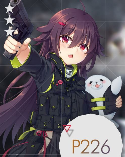 三星手枪人形P226!P226在世界多个执法机关和军事组织中服役,综合性能非常优秀。在少女前线中,她是一位自尊心很高的战术少女,对M9比自己人气高的事情非常在意。她抱在怀里的玩偶叫“包子”,饿的时候会忍不住咬上一口。