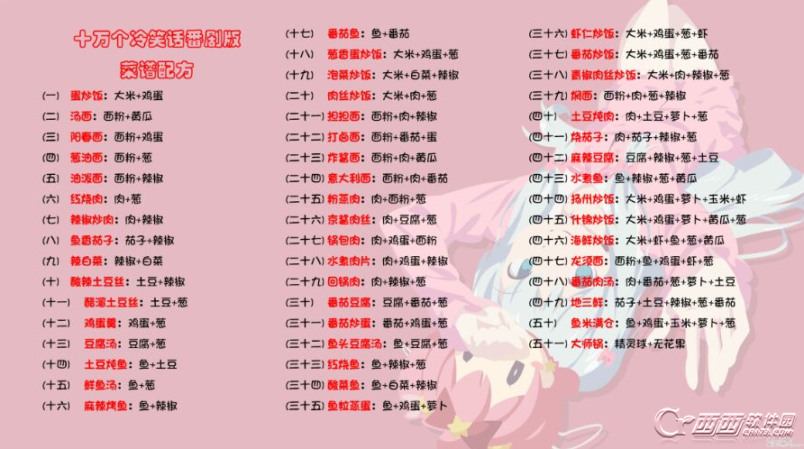 十万个冷笑话番剧版有一个神秘的电饭煲,用它可以制作不同的料理,料理可以给怪物食用加忠诚度,在副本中提升属性能力。下面是大锤为各位玩家分享的十万个冷笑话番剧版菜谱配方大全,希望大家喜欢。