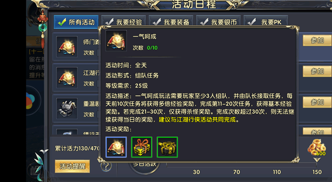 这个任务不论前期还是后期练级中,建议玩家都是每日必做的。这个任务经验是爆发般的丰厚异常,此玩法需要玩家至少3人组队,并由队长接取任务,每天前10次任务将获得多倍经验奖励。玩家在进行此任务时不妨连江湖行侠一起接取,这两个任务是相辅相成、互相配合的,玩家在接取活动的时候切记要两个一起,能做到事半功倍。
