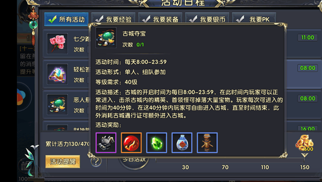 古城夺宝这个活动是强大自己最好的升级方式之一,你越强大获得的经验就越高。每天八点开启,每次可以在副本中待40分钟,建议玩家一定要在副本中待够时间。一定要组成五人一队,这样保证每波怪的旁边都是自己人,等精英怪以及首领怪出来之后喊队友一块打,确保每波怪的仇恨都是我方的,首先就需要眼快手快,抢怪快。