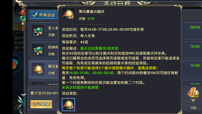 据点跑环这个任务在玩家达到45级后开启,据点活动需要在1线完成。值得一提的是,这个任务每天限时限量提供,玩家们一定要掐紧时间准时上线接取。若是据点归属帮会的成员可选择帮贡接取或金币接取,而其他玩家只能选择金币接取,但是任务完成后能得到丰厚的经验奖励。每天每个玩家只能选择2个据点进行跑环,请谨慎选择。